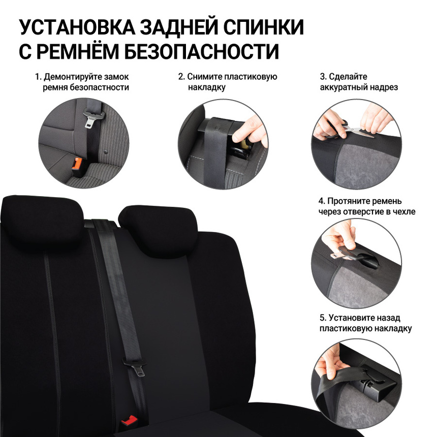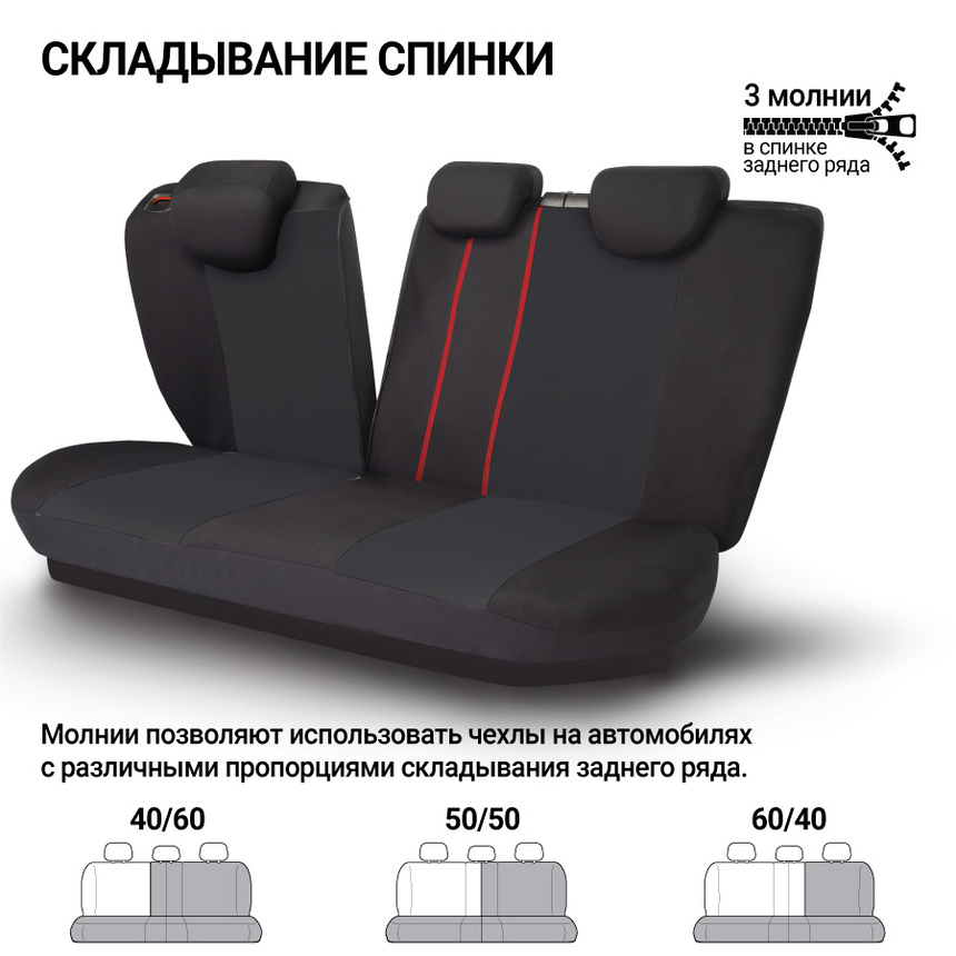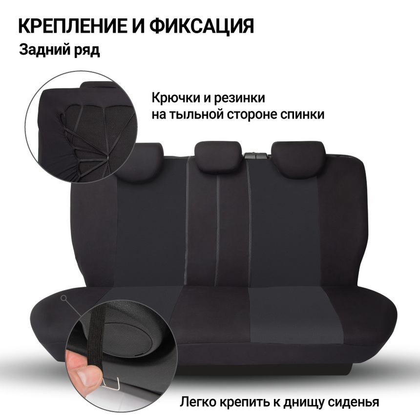 Чехлы из полиэстера отличаются длительным сроком эксплуатации. Ткань хорошо пропускает воздух и отводит влагу, достаточно эластична, чтобы хорошо садиться на сиденья, но при этом прочная и устойчива к растяжению. Универсальный размер подходит большинству автомобильных сидений. Есть специальный распускаемый шов для боковых подушек Airbag на передних сиденьях. Молнии в спинке заднего ряда разработаны для модульных сидений с секциями 40:60, 50:50, 60:40.