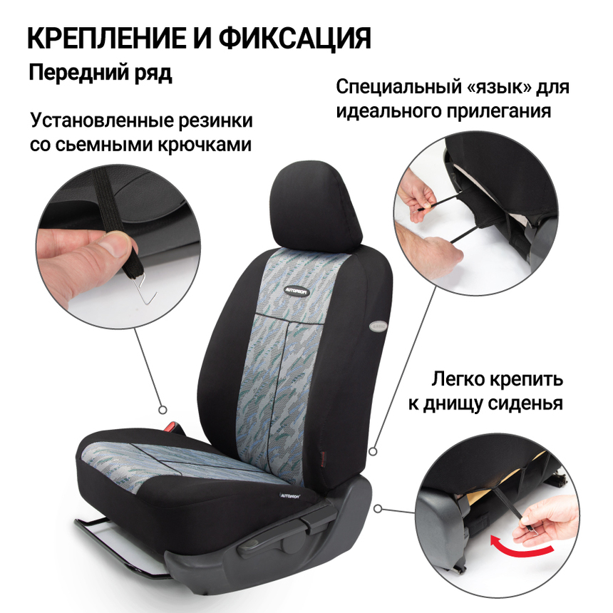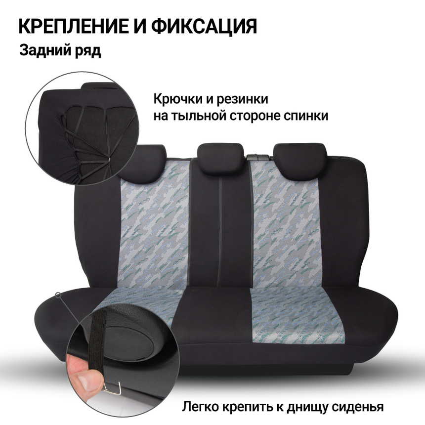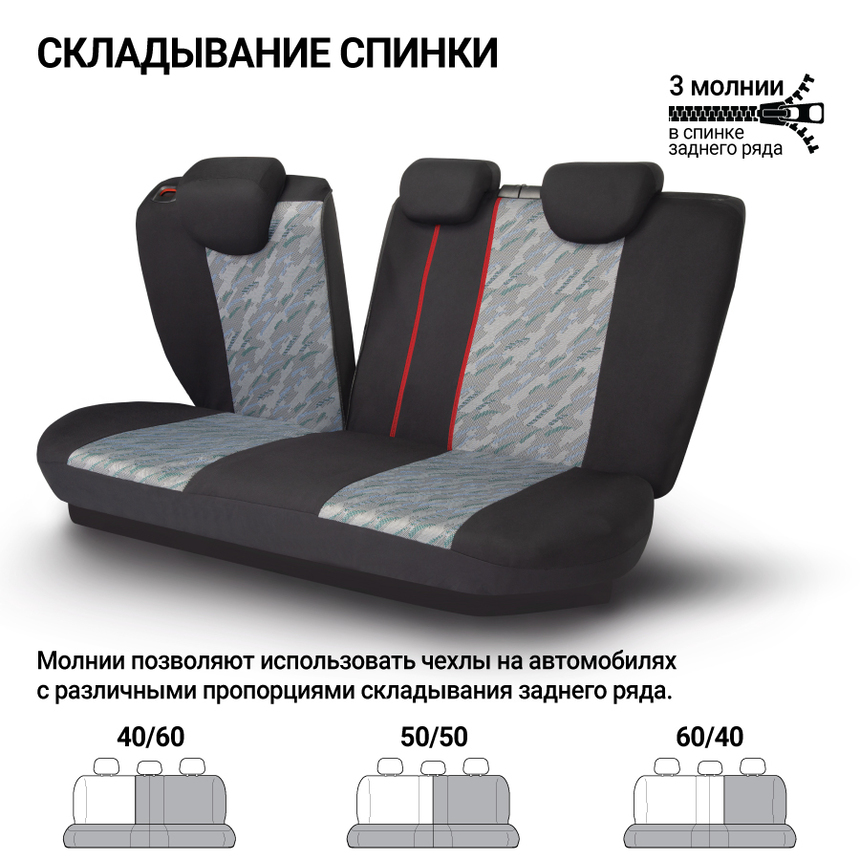Чехлы из прочного жаккарда для переднего и заднего ряда. Сложное плетение ткани создает красивый объемный узор. Чехлы их жаккардовой ткани устойчивы к растяжению. Материал хорошо пропускает воздух и отводит влагу. Универсальный размер подходит большинству автомобильных сидений. Распускаемый шов для боковых подушек Airbag на передних сиденьях имеет специальную метку, чтобы исключить неправильную установку чехлов. Молнии в спинке заднего ряда для модульных сидений с секциями 40:60, 50:50, 60:40